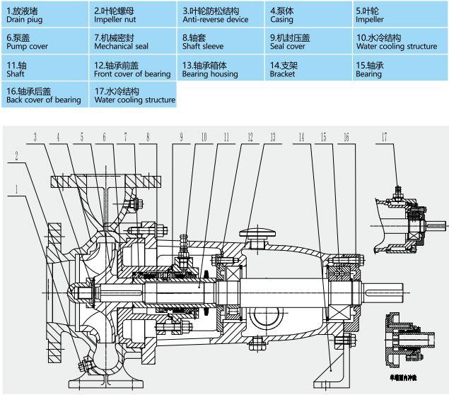 臥式后開門結(jié)構(gòu),泵頭與電機(jī)采用關(guān)軸器連接,安裝在底板上,葉輪為閉式,半開式,開式,軸封采用雙端面機(jī)械密封,設(shè)有冷卻裝置,軸承體的油位用油鏡觀察;結(jié)構(gòu)緊湊合理。該泵在泵體上鑄有支腳,可承受來(lái)自管路的荷載并直接傳給基礎(chǔ),這樣泵轉(zhuǎn)子不會(huì)因泵承受荷載而產(chǎn)生彎曲,從而保證了承載和機(jī)械密封具有良好的使用壽命。維修時(shí)不需將與泵體相連的管路打開,只要打開托架與泵體的螺栓,將兩者分開就可維修葉輪和機(jī)械密封,簡(jiǎn)易方便,。